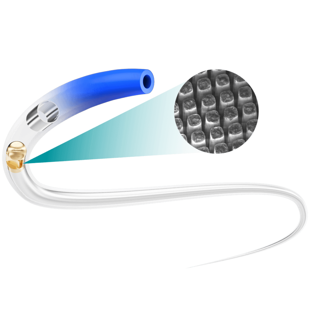 锥形变径声窗设计,亲水涂层,更小摩擦阻力 纤细导管体设计,尖端尺寸<2.0Fr,有利于进入狭窄血管